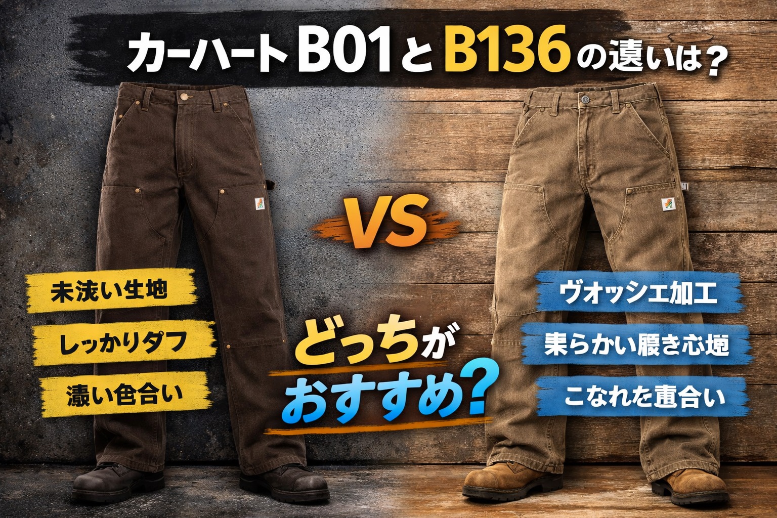 カーハート b01とb136の違いを、履き心地や生地の仕上げ、風合いなどからやさしく比較しています。