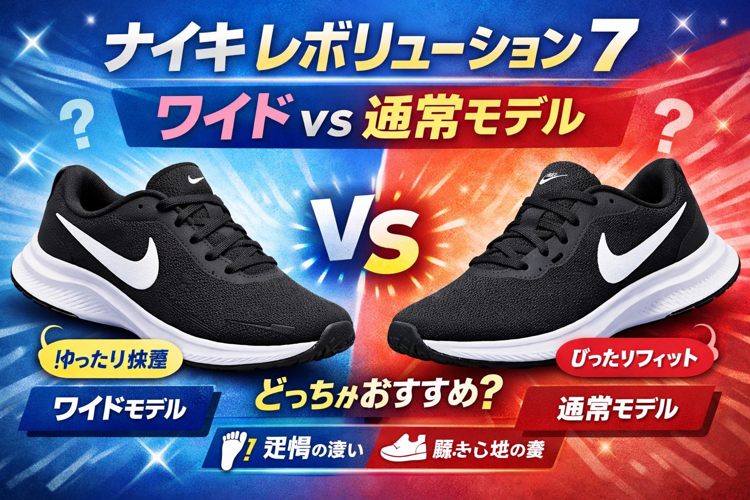 ナイキ レボリューション 7 ワイドと通常モデルの違いについて、表で比較しながらどっちがおすすめか本文で詳しく紹介します。