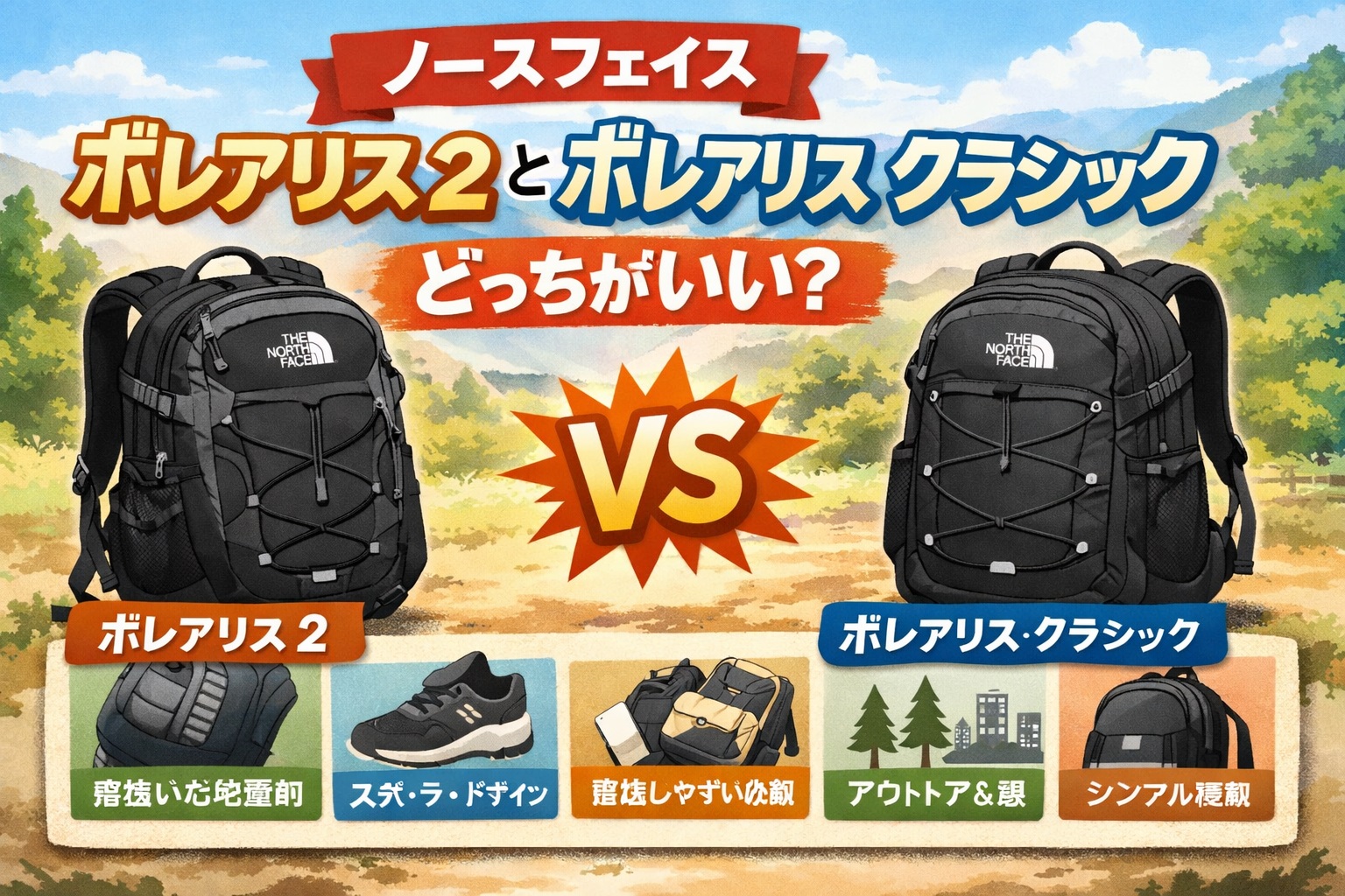 ノース フェイス ボレアリス 2とボレアリス クラシックの違いをわかりやすく表で比較します。
