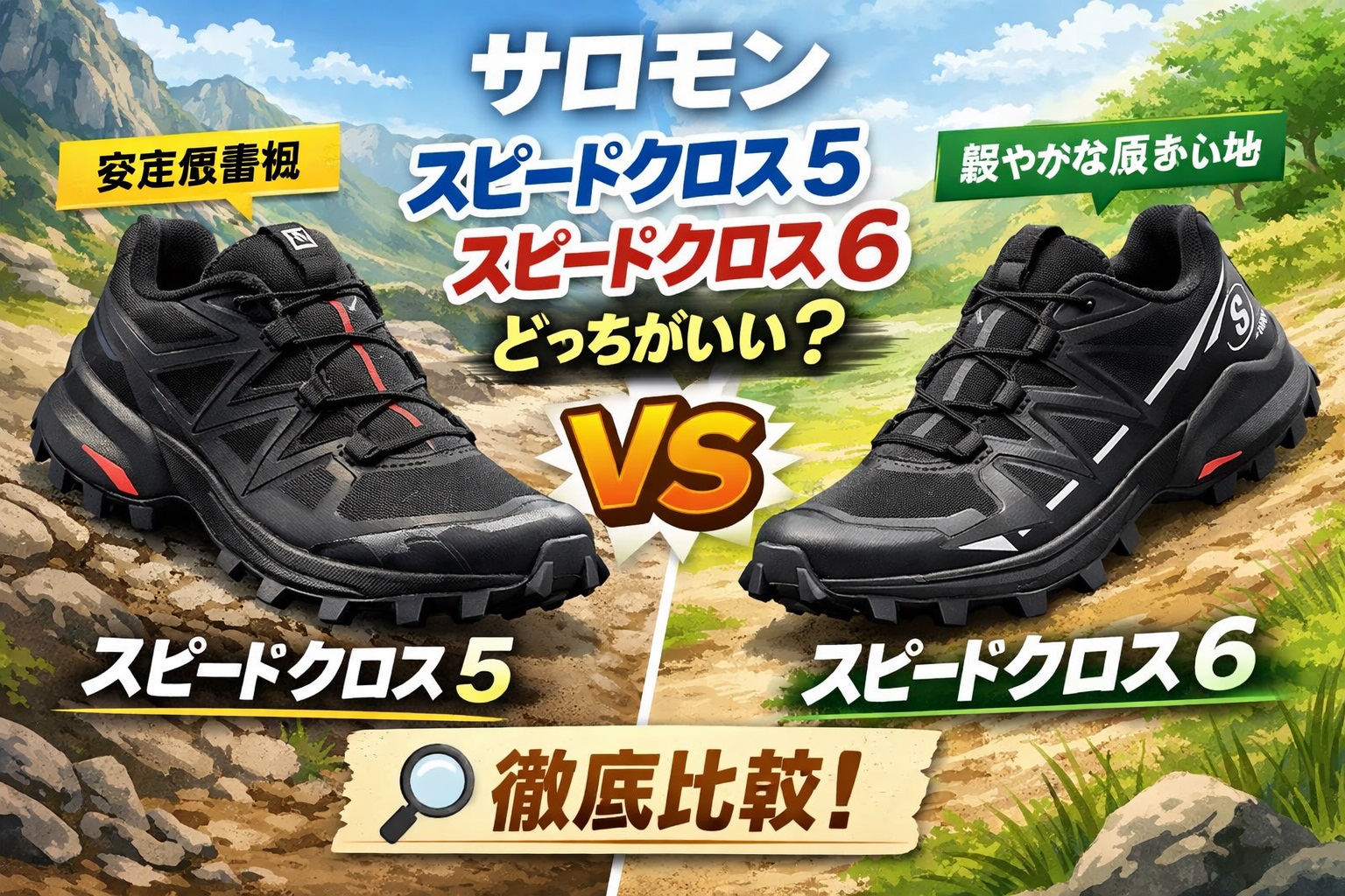 サロモン スピード クロス 5とスピード クロス 6の違いを、フィット感や履き心地、特徴を中心にやさしく比較しています。